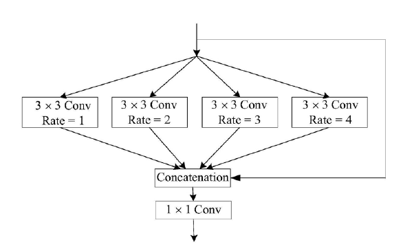 具体来说,由对比文件2中的说明书附图中的附图2(如图1-11所示)可知,在对比文件2中所涉及的是,采用4个并行的、具有不同扩张率(Rate=1、Rate=2、Rate=3、Rate=4)的空洞卷积层的分支,分别对输入进行处理,再将输入与4个分支的输出特征图进行融合,以得到融合后特征。而如图1-12所示,该申请的权利要求4中涉及的分支处理,除了包含空洞卷积处理之外,还包含卷积处理,且每次分支处理包含的卷积处理次数各不相同,具体来说,左边分支的处理方式为先进行一次卷积处理再进行一次空洞卷积处理,而右边分支的处理方式为先进行两次卷积处理再进行一次空洞卷积处理,通过对比两个模型结构的结构示意图可以更直观的说明从该申请的权利要求4中补充的内容与对比文件2中在实现特征提取时所进行的处理实际并不相同。